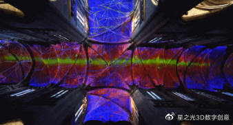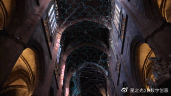 法國數(shù)字藝術家 Michel Chevalier在法國羅德茲大教堂內(nèi)設計了一套3D投影儀,它與大質(zhì)量恒星爆發(fā)的理念相結合,向建筑中心投射出30種不同色彩的光線。
