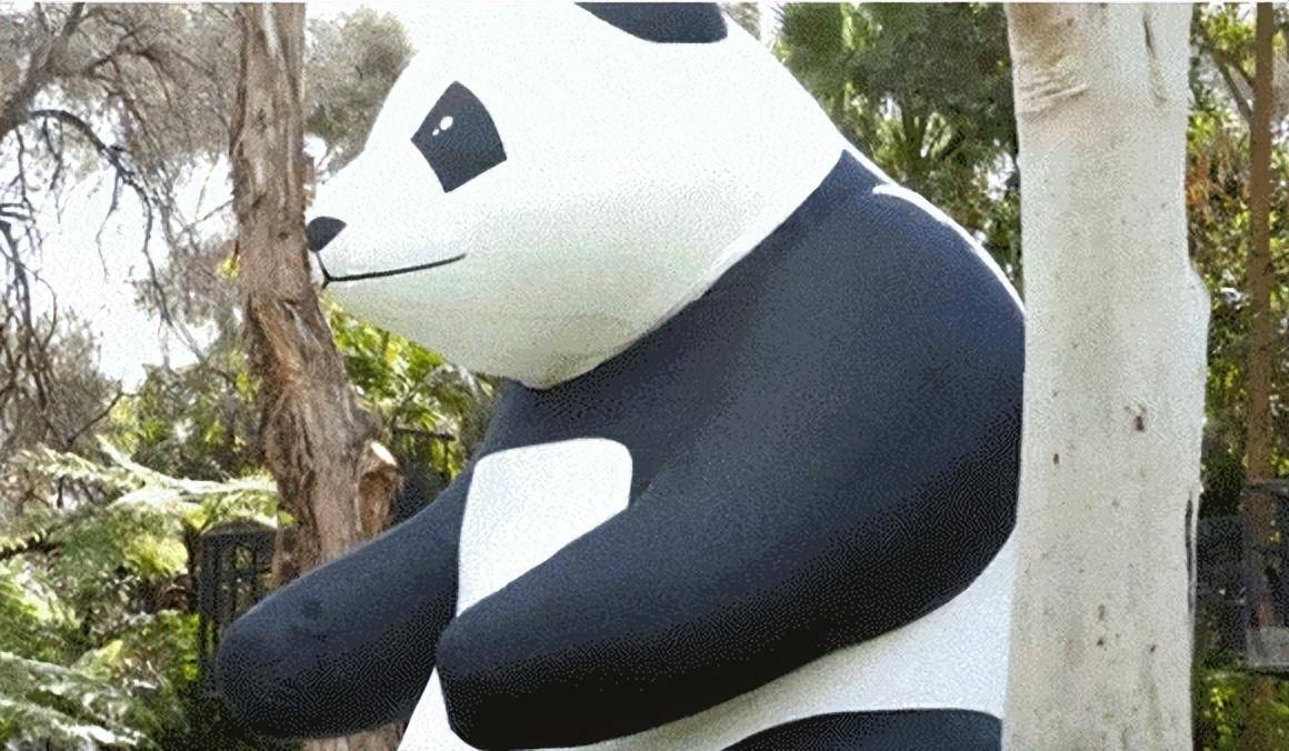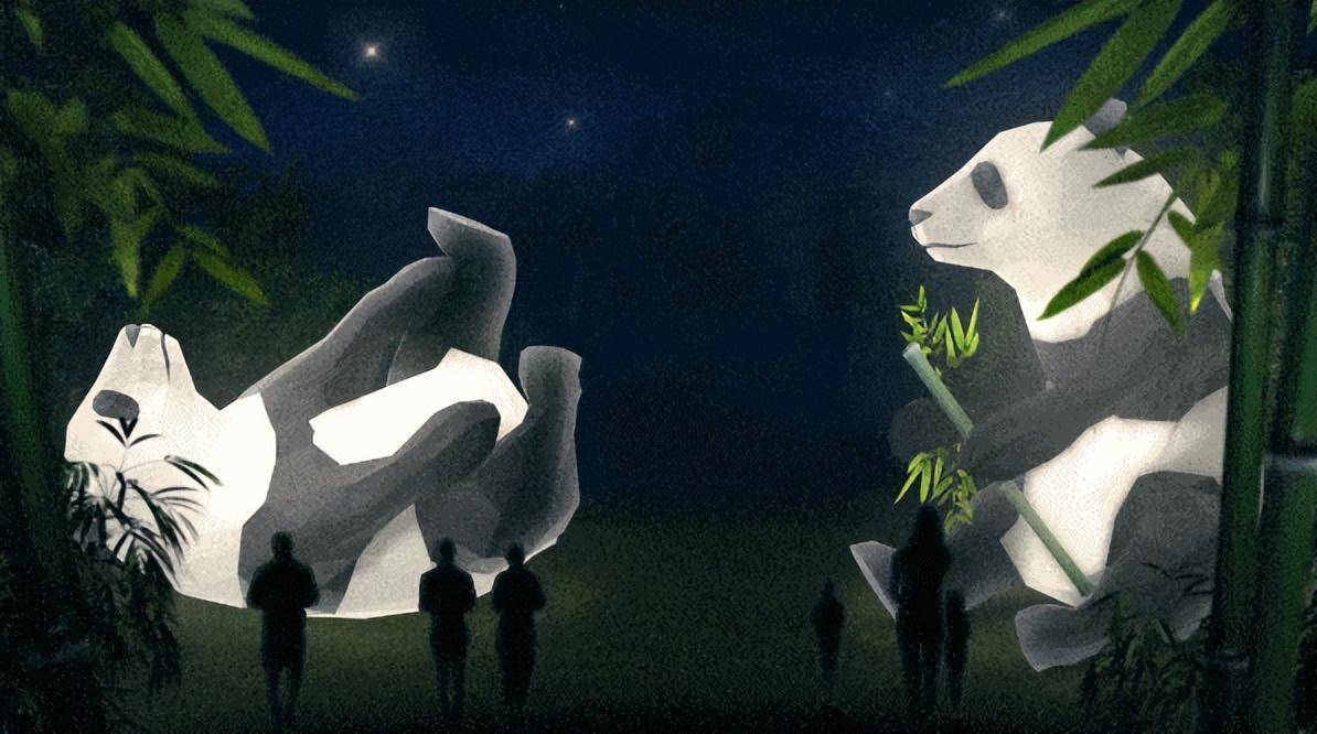 在中央草坪上嬉戲翻滾,啃著竹子的大熊貓。