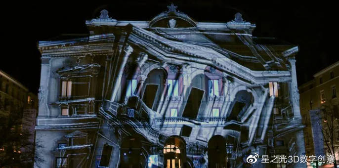 建筑投影技術(shù)是利用建筑物自身的結(jié)構(gòu)特征,采用3D Mapping,將室外投影技術(shù)投射到建筑物上。不同的場景切換,給人一種視覺上的錯覺,仿佛身臨其境一般。