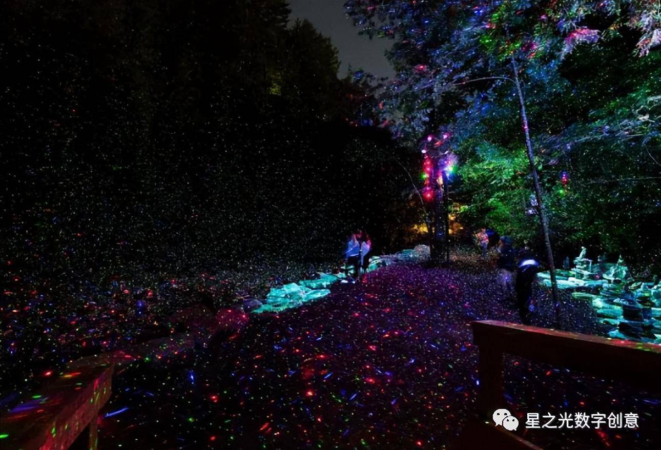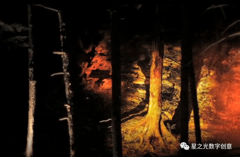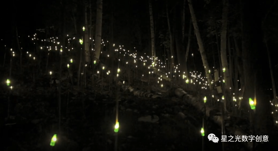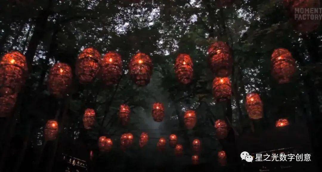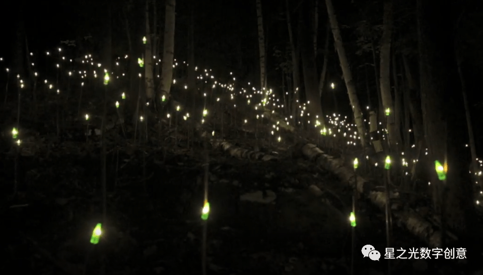 Moment Factory運用了原住民傳說之中的神秘色彩,巧妙地與光影藝術(shù)效果進行堆疊,給森林注入了神秘且魔幻的色彩。